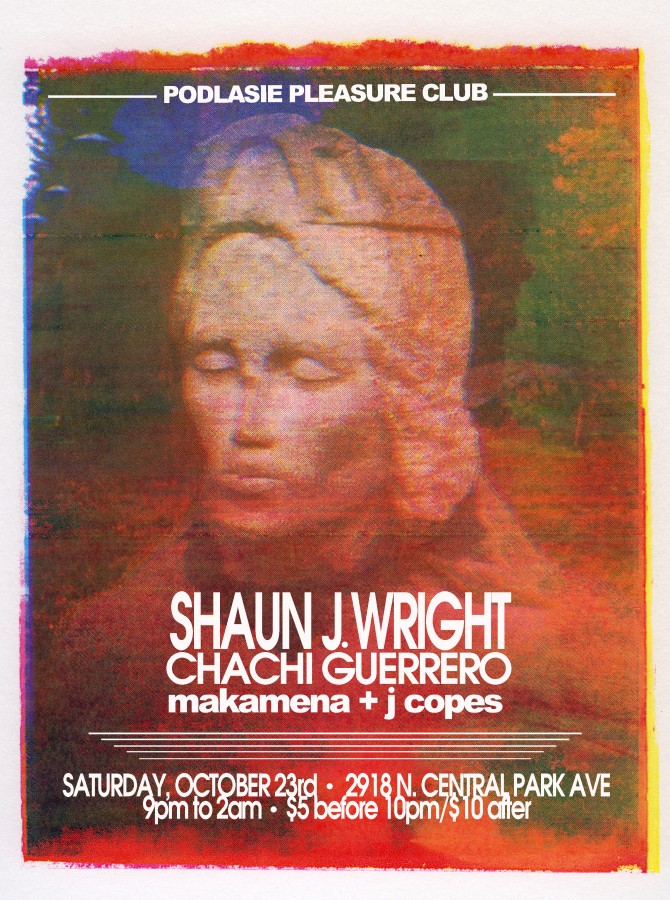 OCT 23rd, Vol. III: Excited to announce the next installment of Podlasie Pleasure Club with Chicago’s very own Shaun J. Wright & Chachi Guerrero // Make sure you get there early to beat the line and catch residents Makamena_ & j copes open up the dance floor ceremonies for the evenin. As always, cash at the door. Cash only bar. 9-2AM. 2918 N Central Park Ave. See you in the pleasure trove.