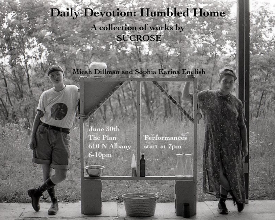 SUCROSE, a performance duo compromised of Micah Dillman and Sophia Karina English, is pleased to present “Daily Devotion: Humbled Home” a collection of sculptural, video, and performance works reflecting on the last eight years of our collaborative practice.