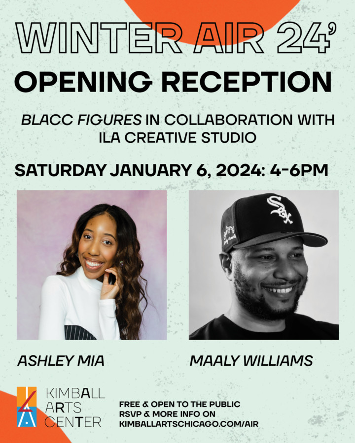 Join the Kimball Arts Center in welcoming Ashely Mia and Maaly Williams as our 2024 Winter Artists in Residence. Selected in collaboration with ILA Creative Studio’s BLACC Figures program, the Kimball Arts Center is honored to support the mission of ILA and platform emerging Black artists in Chicago. Come view the exhibition, have a drink and make a friend or two!