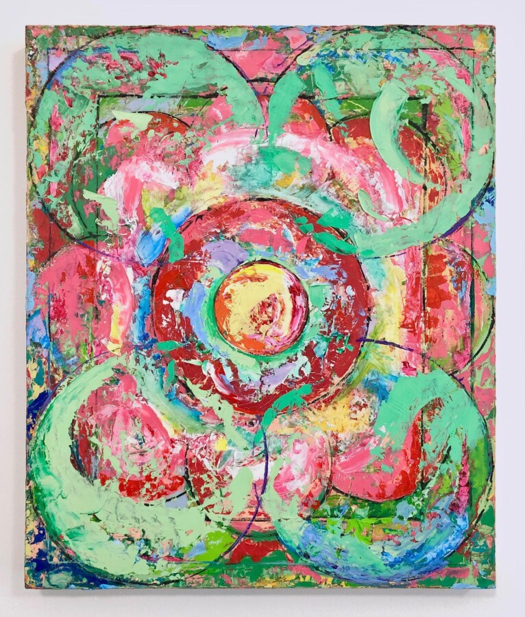 Surrounding the central dusky red orb in Nine Circles are eight other overlapping discs in artificial forest green scrapes, minty ice cream scoops, and daubs of pink the color of gum that’s been hitchhiking under your shoe sole, all disintegrating into and out of one another. In Red Keyhole with Circles, a white backdrop of a square gets muddied with more overlapping circles like dried rings of strawberry smoothie from an overflowing cup left without a coaster; residue of a saccharine party all pulling the viewer’s gaze toward the central vertical “keyhole” through which to peer (and leer) at something maybe we’re not supposed to. Some Flowers, The Sun (Clay Pot) coalesces these bits of visceral geometry into some of the most representative “imagery” in the show, an arrangement of flowers built like moon cups and magic wands (read also: “magic wands”) being shorn through by bands of coagulated red sun beams.