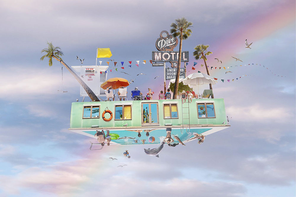 Harrold’s body of work today is a result of her education and background in traditional studio art and photography. After spending some time in professional digital editing and photo retouching, she utilized the Photoshop skills she had learned and began exploring the medium of digital collage. Now, when taking photographs, she does so with the intention of using specific elements as building blocks into a new world. “I love working with photography because, by tradition, it is meant to document reality. I, instead, create my own,” she says. The reality Harrold creates is one filled with floating buildings, friendly beasts, and fantastical adventures – meant to reflect the uncertainty of the real world. A world that she believes we all have the power to challenge: “We are all strong enough to live beyond our circumstances and achieve more than we are expected to. At the same time, we are a part of our environment and this universe. We need to live with it and protect it. Hopefully my work has the power to inspire all these things in some way or another.”