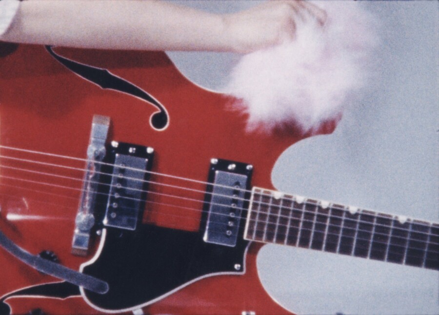 Created in 2000, A Little Thought is Canadian conceptual polymath Rodney Graham’s atypical single-channel piece, a music video for a song written and performed by the artist, featuring bucolic scenes of cherry blossoms and paddling swans intercut with images of a guitar lovingly caressed by a pink fur puff.