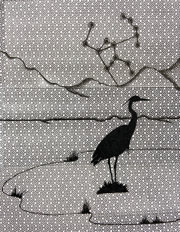 The Birdland series is an exhibition of drawings on collaged security envelopes — envelopes used for bills, bank statements and other mailings requiring privacy. Different environments and environmental concerns strongly influence my imagery and the materials I work with. The Birdland series reflects my recent travels to the mountain west, rust belt cities like St. Louis and the Shawnee National Forest surrounding my home in Southern Illinois. Birds play a role, as our old farmhouse lies along one of the largest migratory bird routes in the country — the Cache River Flyway.