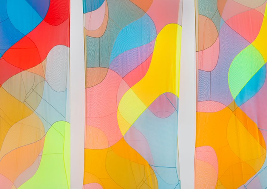 Chicago-based artist Katrin Schnabl’s practice spans various disciplines that include visual art, sculpture, fashion, dance, performance and installation, fusing movement, pattern and conceptual investigation. She creates dimensional installations and sculptures with chroma-tinted sheer stitched fabrics, dynamically engaging the viewer to explore the body’s spatial awareness and activate the senses. Schnabl continues to collaborate with and contribute to numerous acclaimed dance and performance projects, which deeply informs her distinct approach. Schnabl studied dance in Frankfurt, and Fashion Design at FIT, NYC. Since launching her first collection in NY in the 1990’s she has expanded her visual, spatial, and kinetic practice with fashion in an ever-expanding context through movement activated capsule collections, installations, and curated experiences. In 2004, she followed an invitation to teach at the School of the Art Institute of Chicago. Throughout her creative trajectory she engages sustainability, conceptually and pragmatically, such as her work with repurposing discarded plastic. Recently her work was included in New American Painting, shown at Pan American Art Projects in Miami; featured on stage with scenic and costume design for the San Francisco Ballet, as well as featured in two solo exhibitions in Chicago, and at Devening Projects in the exhibition EVERSO with Jodi Hays.