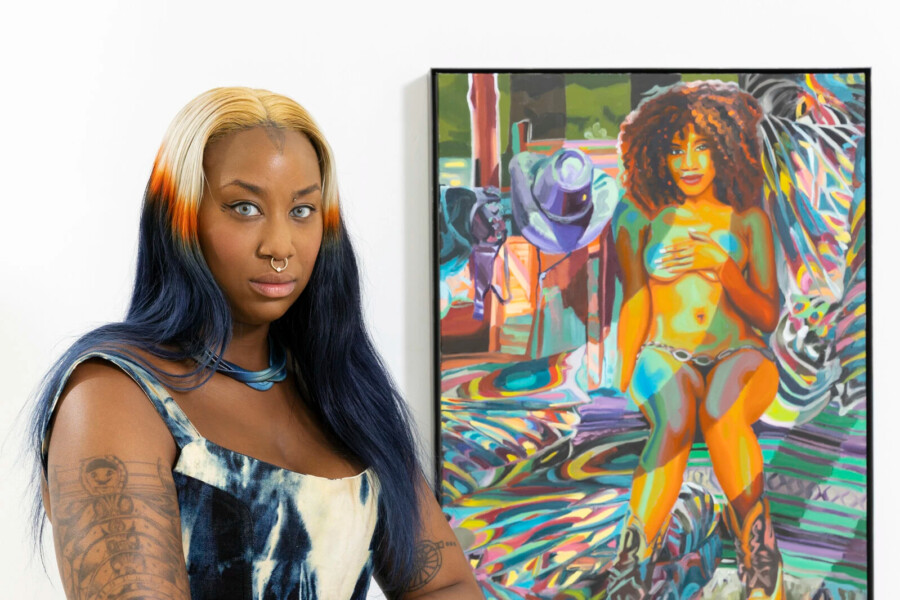 Caitlin Cherry (b. 1987, Chicago, IL), a painter of cyber-multitudes, draws on sculpture and installation in her multifaceted practice, coalescing into articulate and alluring representations of Black femininity. Filtering media through layers of digital manipulation, her work draws parallels between Black femme bodies, frequently commodified and positioned as sexual assets, and the seductiveness of art objects in the commercial gallery circuit. Cherry is Assistant Professor of Painting and Printmaking at Virginia Commonwealth University and the founder of the online program Dark Study, a contra-institutional space for radical learning about art and theory.