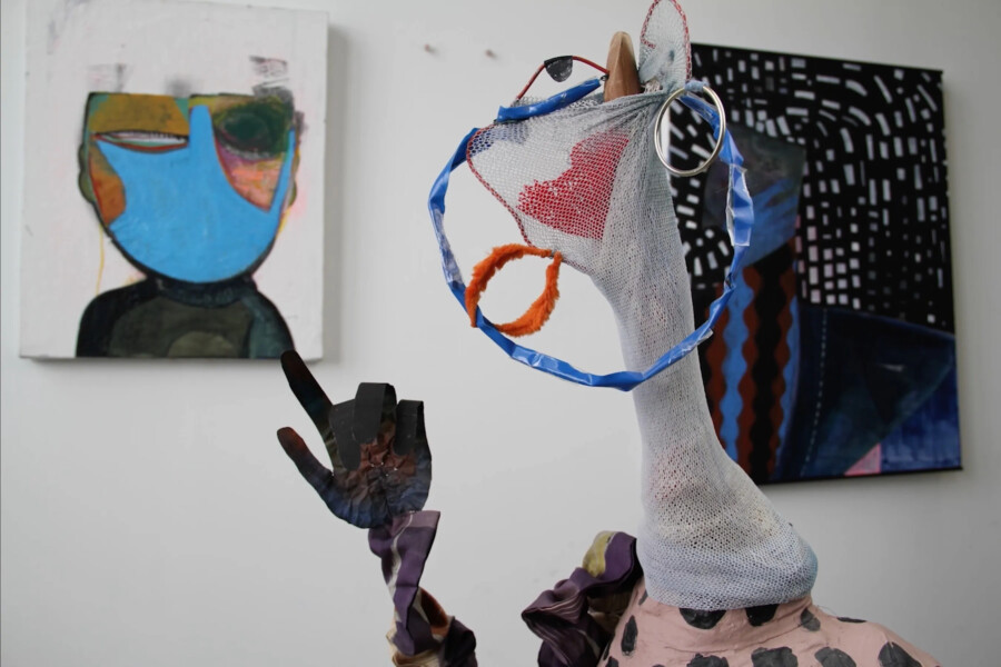 She works across media, combining performance, installation, painting, and sculpture to create intricate setups that result in photos, drawings and animations.