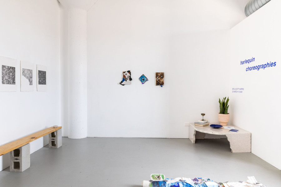 For Harris, painting is an arena, or a choreographed dance to explore the full spectrum of bodily experience, and each material choice carries metaphorical weight – graphite as bone, liquid agents as bodily fluids, canvas, linoleum, and plastic as skin. “Through carefully constructed studio situations, I allow my body to unfold in time, creating works that function simultaneously as performance relics, concretions of lived experience, and materializations of possibility. I’m fascinated by how our bodies and sense of self dissolve, evolve, and reverberate within unified space.” The term harlequin very much embodies both the performative nature of Harris’ use of his body within the practice of making through his very structured studio interventions, but also in the iconography of the diamond within the material itself.