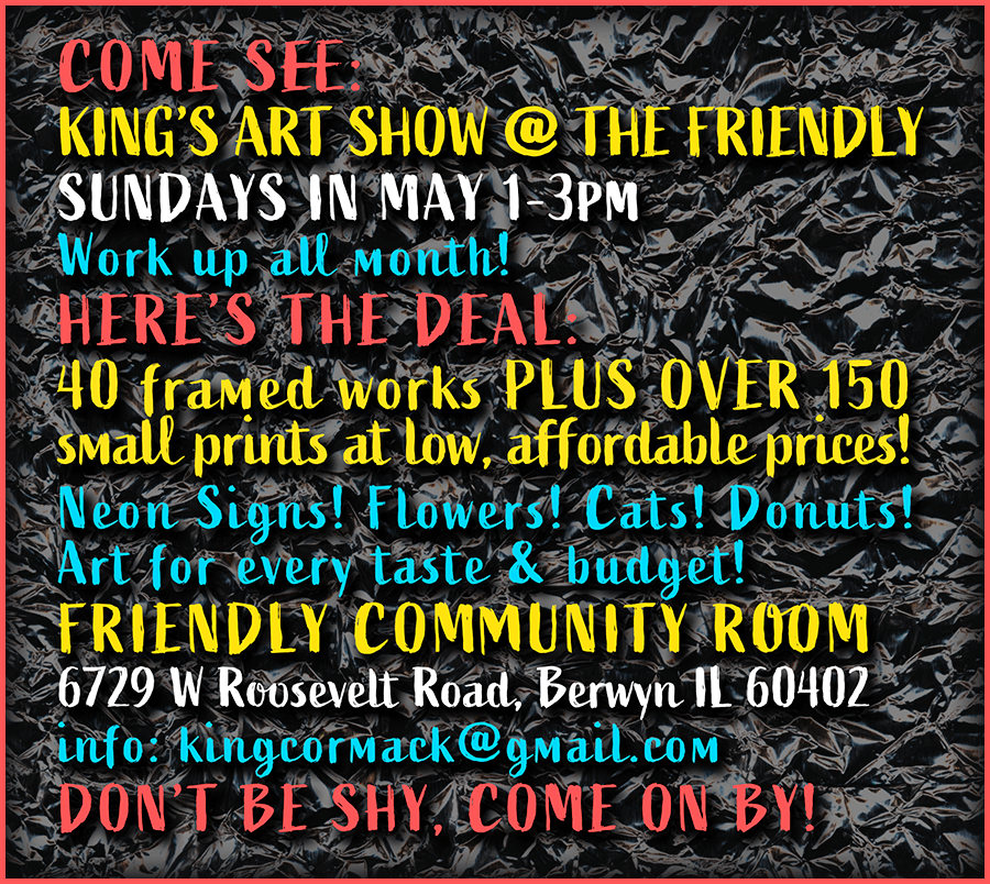 Tags: Berwyn, Friendly Tap, King Cormack, KING’S ART SHOW @ THE FRIENDLY, Oak Park, Poison Squirrel, Roosevelt Road