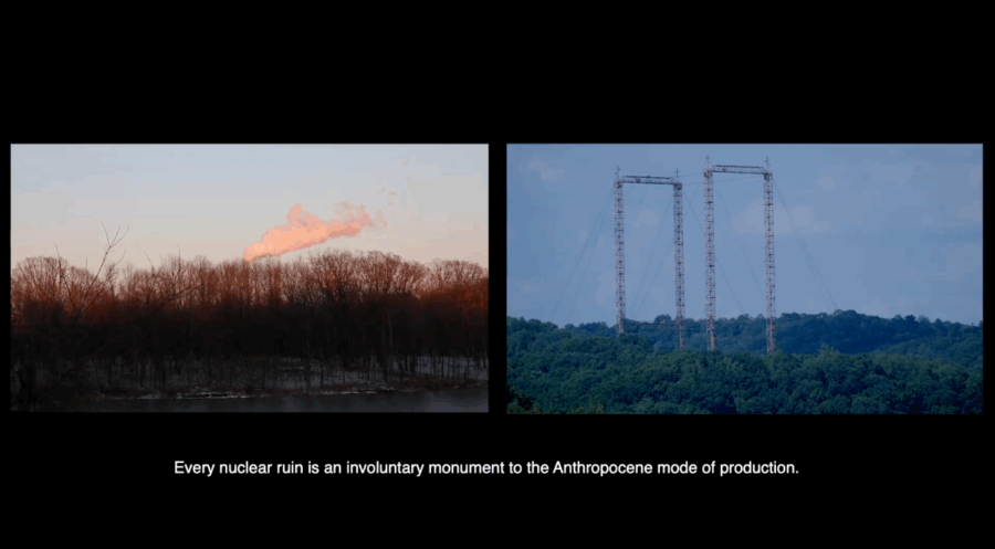 Born Secret begins in Metropolis, Illinois, where the fictional Superman discovered kryptonite, his one fatal weakness. In this sleepy little town on the banks of the Ohio River, a real factory produced uranium hexafluoride gas, which was enriched for use in nuclear bombs at another site just across the water, in Paducah, Kentucky. The two forgotten factories exemplify the science-based production process of our own fatal weakness: the “Great Acceleration” of the Anthropocene, whose geological threshold is marked by fallout particles deposited across the earth during the period of above-ground nuclear testing (1952-1964). The video follows this “Anthropocene mode of production” to its top-secret origin at Oak Ridge Laboratory, where the Manhattan Project drew on hydroelectric power furnished by the river-basin development program of the Tennessee Valley Authority.