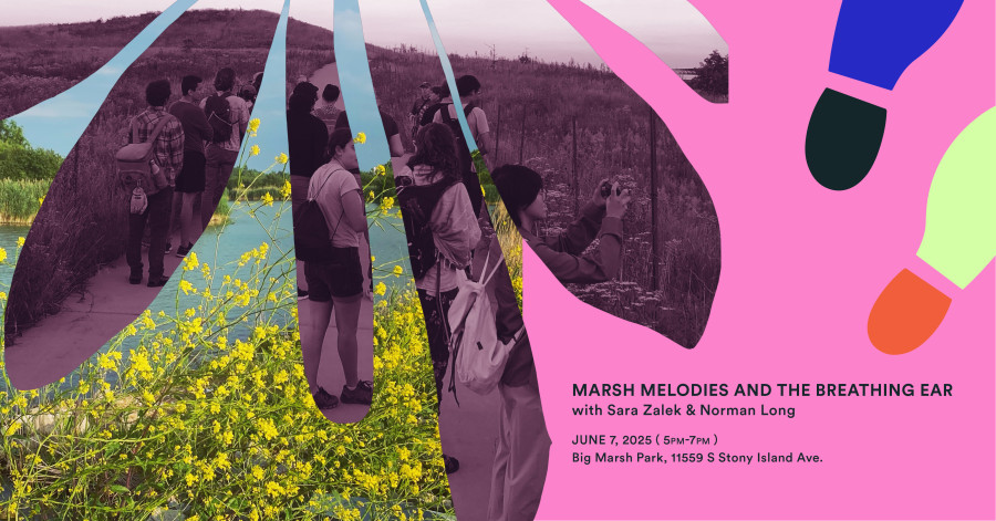 Join Sara Zalek & Norman Long for a soundwalk along Big Marsh’s expansive and recovering landscape/soundscape. The artists write, “As a silent mass, diverse and in solidarity, we listen out for and to the layers of sounds most often tuned out or discounted, points of unity, resonance, dissonance, and divergent noises. Our walk includes meditation practice, ear calibration exercises, interactive recording demonstrations, and performance.” Big Marsh Park is located at 11559 S Stony Island Ave. We will meet at the pavilion or covered meeting area. Click here for accessibility information. Please note the rain date for this event is Saturday, June 14, 5:00 PM – 7:00 PM.