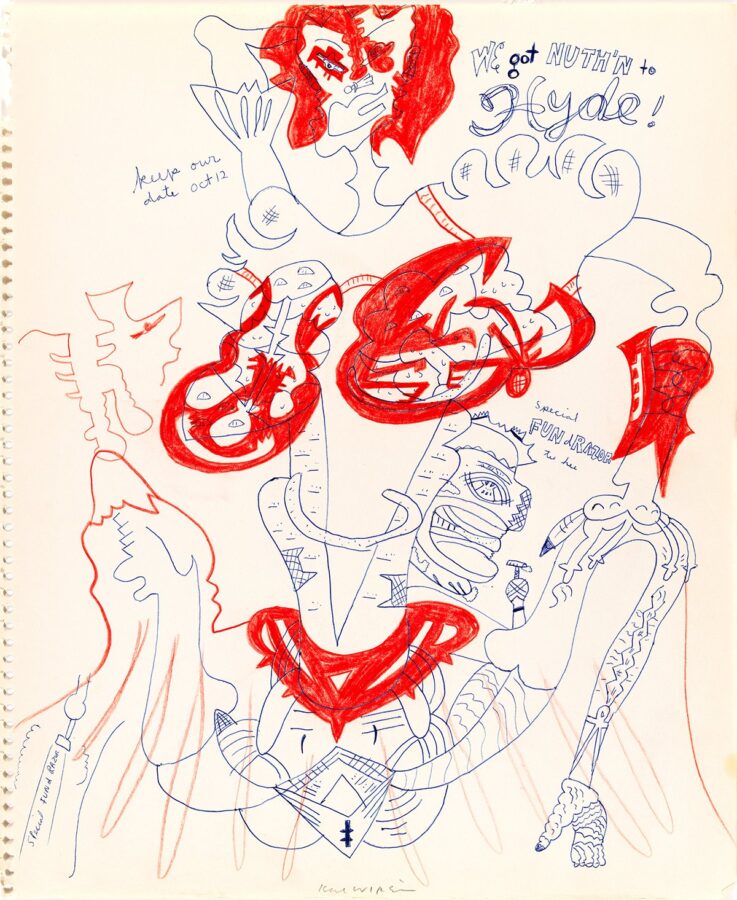 Although its placement in the annals of art history has been linked to exhibitions there in the latter half of the 1960s, the Chicago neighborhood of Hyde Park had been an enclave for artistic activity starting decades earlier. This focused group show gently decenters the Hyde Park mythology, configuring the Imagist shows at the Hyde Park Art Center as a continuation of the neighborhood’s longstanding bohemianism and experimentation. At the center of the exhibition sits painter Gertrude Abercrombie, whose recent “discovery” and meteoric ascent in the contemporary art world, fifty years after her death, has come as a surprise to her many admirers in Chicago. Spotlighting an important canvas first unveiled in 1945 at the Renaissance Society (also located in Hyde Park) and a tiny self-portrait in a thrift store frame, the show presents never-seen portraits of Abercrombie by Karl Priebe and Ceil Rosenberg. The exhibition features work by Eleanor Coen and Max Kahn, whose printmaking activities were based in the south side neighborhood in the 1930s and ’40s, as well as fellow Hyde Parker Miyoko Ito, represented by an early canvas, and a “binocular” painting by Harold Haydon, an artist and critic closely associated with the University of Chicago. One of the most beloved and colorful artists of Hyde Park, Cosmo Campoli is present with his signal 1950s bronze “Birth of Death.” Don Baum, like Campoli, was associated early on with the Monster Roster; as director of the Hyde Park Art Center, Baum went on to help facilitate the Hairy Who, False Image, and Non-Plussed Some Imagist shows, and is included in “Nuth’n to Hyde” with two pieces from the 1960s, one of which is an assemblage portrait of collector and Hyde Park social maven Ruth Horwich. From the Imagist camp, the show presents works by Karl Wirsum (the elaborate flyer from which comes the show’s title, together with its original sketch), a piece by Jim Falconer shown in the third Hairy Who exhibition, replete with its original price tag, and a sensational Jim Nutt painting from the mid 1970s.