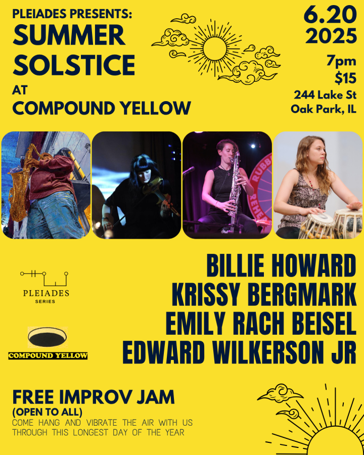 The Pleiades Series teams up with Compound Yellow to present this beautiful evening of sound on the longest day of the year. We’ll have a quartet featuring four heavy-hitters of the Chicago creative music community: Krissy Bergmark (tabla), Billie Howard (violin), Emily Rach Beisel (bass clarinet/woodwinds) and Edward Wilkerson Jr (woodwinds +).