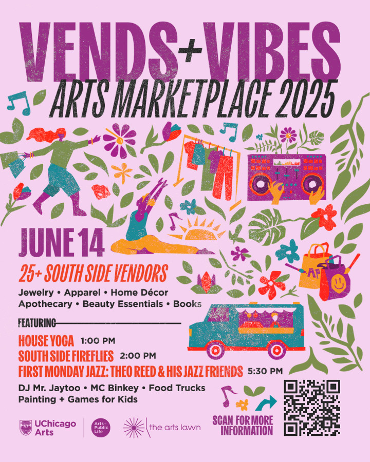 Get ready for the return of Vends + Vibes, Arts + Public Life’s annual summer arts marketplace celebrating the incredible creative entrepreneurs of the South Side! Join us on the Arts Lawn on Saturday, June 14, 2025, from 1:00 to 7:00 PM, for an afternoon where artists, makers, and neighbors connect, shop, and share the lively energy in Washington Park.