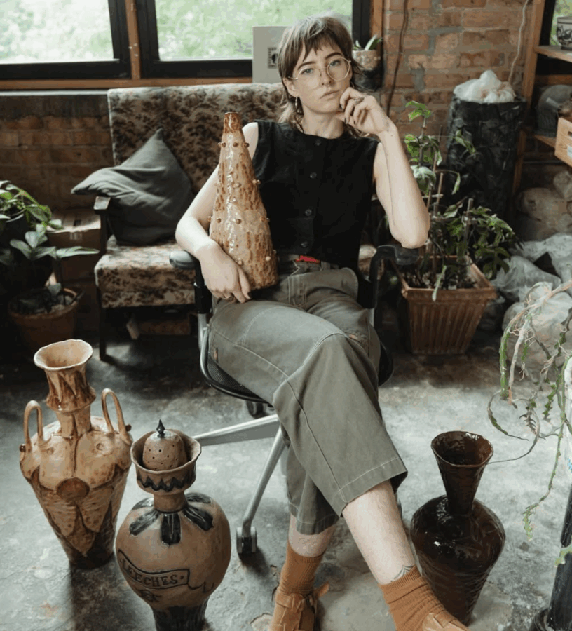 Penn draws from an archive of collected apothecary bottles, building ornate forms with delicately wrought stoppers and cinched bottlenecks. Draped in cascading geometric patterns, the vessels seem to twist and move as supple bodies.