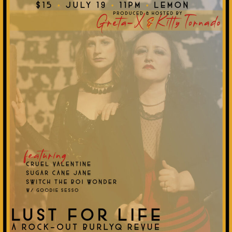 Lust for Life: A Rock-Out BurlyQ Revue is back July 19th and ready to rock SEXY SATURDAY, LATE NIGHT AFTER JAZZ! Hosted, produced, & curated by Chicago burlesque besties Greta-X & Kitty Tornado, you don’t want to miss this live rock n’ roll burlesque show that features the very best of Chicago burlesque – and beyond!
