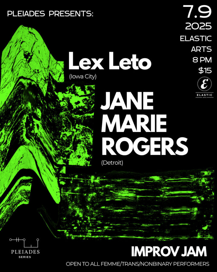 We’re thrilled to kick off July with the first of two shows featuring touring artists! This one brings together musicians from across our fellow Midwest cities. Lex Leto (Iowa City) will perform a set of electronic slumber pop followed by Jane Marie Rogers (Detroit) whose work inhabits betweennesses: finding spaces between safety and pain, stillness and motion, gentleness and intensity.