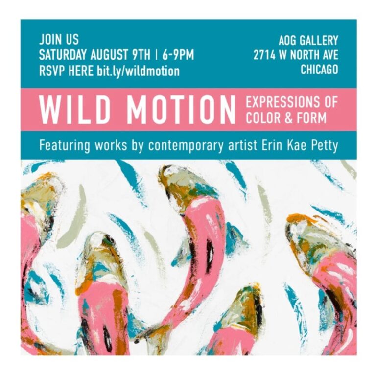 Join us Saturday, August 9th for artist Erin Petty’s solo art exhibition “Wild Motion”. She will be exhibiting new and old work that celebrates the color and form of nature. The show will run from 6-9pm at Gallery AOG and include light refreshments and bites.