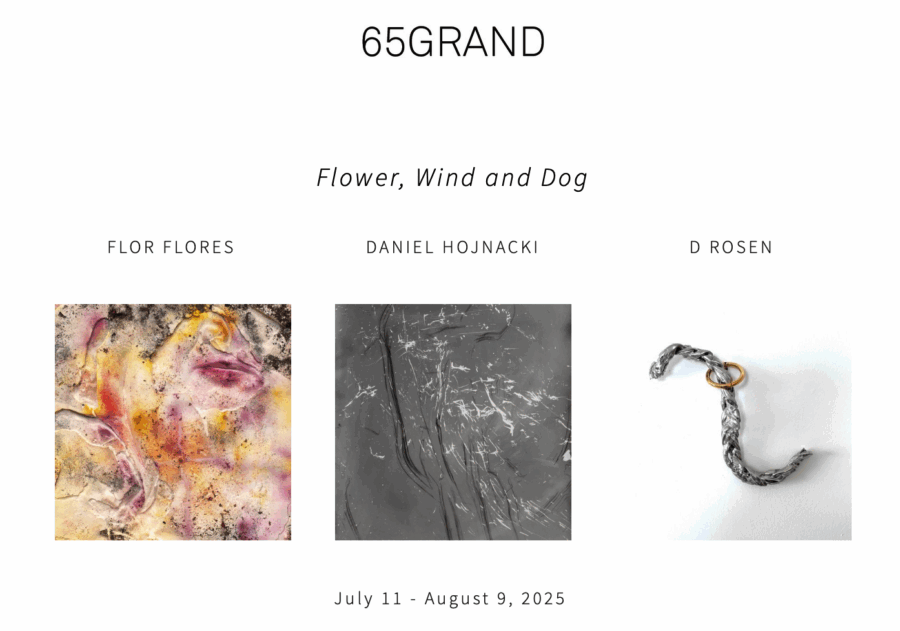 Please join us Saturday, August 2nd at 2:30PM for an artist talk with Flor Flores, Daniel Hojnacki and D Rosen as part of the exhibition Flower, Wind and Dog at 65GRAND