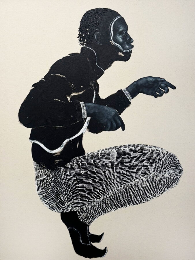 Braxton Garneau is a Canadian artist whose practice spans painting, sculpture, printmaking, and installation, traversing the intersections of material honesty and transformation. Drawing from classical European portraiture and Afro-Caribbean cultural traditions, Garneau create portraits, shrines, and corporeal forms that explore diasporic and colonial histories rooted in his Trinidadian heritage. Antilles Lace, the artist’s first solo exhibition at moniquemeloche, features a series of richly textured portraits using harvested and hand-processed materials such as raffia, and notably, asphalt, which has become a central medium in Garneau’s practice. Asphalt, a powerful, symbolic material linking Pitch Lake in Trinidad (home to his grandparents, and the world’s largest naturally exposed asphalt deposit) to Alberta’s oil sands (where his grandfather came to work in the 1960s), serves as a mutable metaphor for personal and collective identity. Applied in dense layers, the asphalt creates surfaces that feel at once ancient and industrial, fragile yet enduring. As Garneau’s figures emerge, they are adorned with symbols of spirituality, trade, and cultural continuity. Ground pearls and marble dust create a rich pigment which is meticulously hand painted to resemble lace, echoing the delicate, labor-intensive traditions where intricate lace weaving served as both adornment and a quiet assertion of cultural identity within colonial contexts. Taken together, Garneau’s work offers a powerful reflection on how materials carry stories, and how matter and memory can allow the past to surface in new forms.