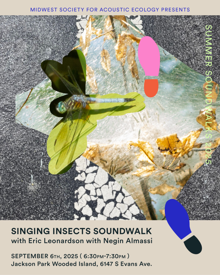 The Singing Insects Monitoring Program is a community science effort to familiarize people with common sounds of singing insects in the Chicago region, including grasshoppers, cicadas, katydids, and crickets. Building on Dr. Carl Strang’s work documenting the many species within these four types across 22 counties, the purpose of the project is to collect local baseline data and help people keep their ears perked for unusual and common insect calls each summer. Data collected is publicly available to anyone who wishes to use it, and walks are conducted informally site by site. Key to this is listening. To enjoy and to learn how to identify these insects by their “songs,” Eric Leonardson prepares us for a soundwalk through engaging “Ear Cleaning” exercises with directions from naturalist Negin Almassi. We will meet at Jackson Park Wooded Island, 6147 S Evans Ave. Click here for accessibility information. Please note the rain date for this event is Sunday, September 28, 2025 6:30 PM – 7:30 PM.