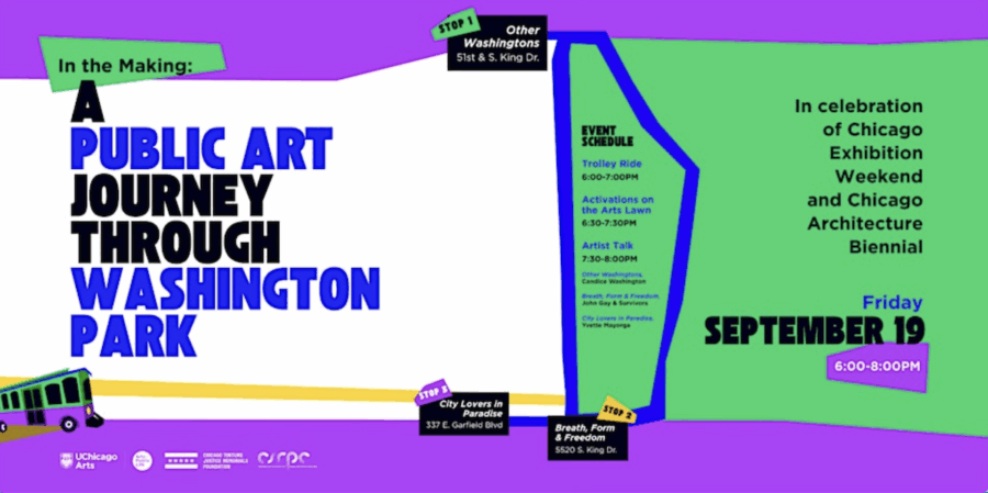 Board the trolley at the Arts Block (337 E. Garfield Blvd.), with a first stop at Amanda Williams’s Other Washingtons at 51st and S. King Drive. Asking “Who is your favorite Washington?,” this new work in development reconsiders the power of names, the complexity of legacy, and the people and stories chosen for memorialization.