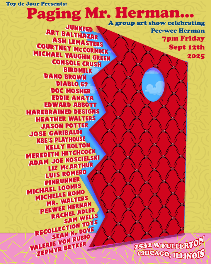 Toy de Jour is proud to open ‘Paging Mr. Herman…’, a group art show inspired by Pee-wee Herman / Paul Reubens. A free, all-ages gallery that opens Friday, September 19th at 7pm at their Logan Square location: