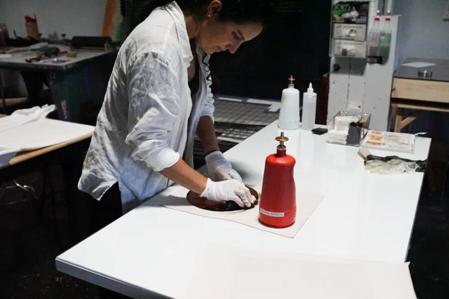 Fernández Díaz’s aquatint print work emerged from a myriad of precise and layered drawings the artist created during her recent time in Oaxaca, Mexico. Rooted in research and intuitive observation, the print will serve as both botanical study and spiritual mapping, evoking cycles of growth, resilience, and transformation.
