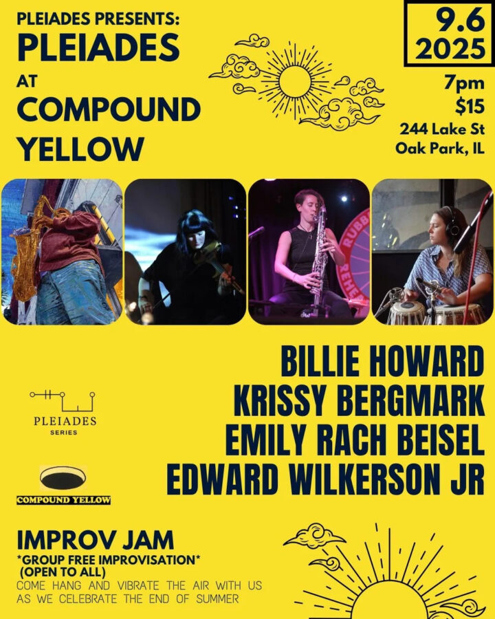 The Pleiades Series teams up with Compound Yellow to present this beautiful evening of sound on the longest day of the year. We’ll have a quartet featuring four heavy-hitters of the Chicago creative music community: Krissy Bergmark (tabla), Billie Howard (violin), Emily Rach Beisel (bass clarinet/woodwinds) and Edward Wilkerson Jr (woodwinds +).