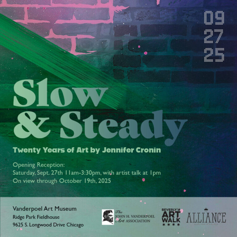The Vanderpoel Art Museum is a memorial collection of nineteenth and twentieth century works honoring the artist John H. Vanderpoel. The museum houses the third largest art collection in Chicago, with over 600 works by 400 artists. It is located at Ridge Park Fieldhouse at 9625 S. Longwood Drive in the Beverly neighborhood of Chicago. More information can be found at www.vanderpoelartmuseum.org. This exhibit is part of the Beverly Art Walk, a neighborhood-wide celebration of art and music happening 11am-5pm on September 27th, organized by the Beverly Area Arts Alliance. More information can be found at www.beverlyarts.org. More information about Cronin’s art can be found at www.jennifercronin.com