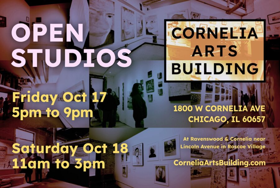 Celebrate the start of the art season at the Cornelia Arts Building October Open Studios. Located at 1800 West Cornelia Avenue, Chicago, Illinois, the all-artist studio building opens its doors to the public on Friday October 17th, with new earlier hours of 5 – 9 pm, and on Saturday October 18th, from 11 am – 3 pm. Visitors can shop two floors of arts and crafts directly from dozens of artists open that weekend, and see what the residents have been working on all summer. Mingle with fellow art enthusiasts and the talented local artist and artisans at one of the largest artist studio building on Chicago’s North side. Guests of all ages are welcome.
