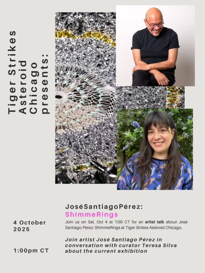 Join us on Sat, Oct 4 at 1:00 CT for an artist talk about José Santiago Pérez: ShimmeRings at Tiger Strikes Asteroid Chicago. Register at link in bio.