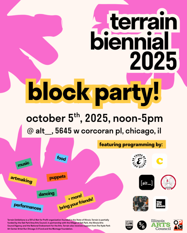 The Terrain Biennial 2025 Block Party is made possible thanks to Alt_, Oak Park Area Arts Council, Illinois Arts Council, the National Endowment for the arts, Hyde Park Art Center Artists Run Chicago 2.0, Compound Yellow, Elastic Arts, and SAIC Service Bureau.