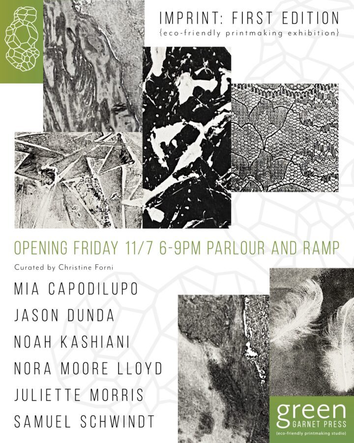 Imprint: First Edition, is a Green Garnet Press Residency Artists Group exhibition curated by Christine Forni at Parlour and Ramp. Opening is Friday November 7th from 6-9pm. Artist are Mia Capodilupo, Jason Dunda, Noah Kashiani, Nora Moore Lloyd, Juliette and Samuel Schwindt. Christine Forni founded Green Garnet Press, an artist’s studio sharing eco-friendly printmaking techniques and is all about creating art in way that cares for our planet.