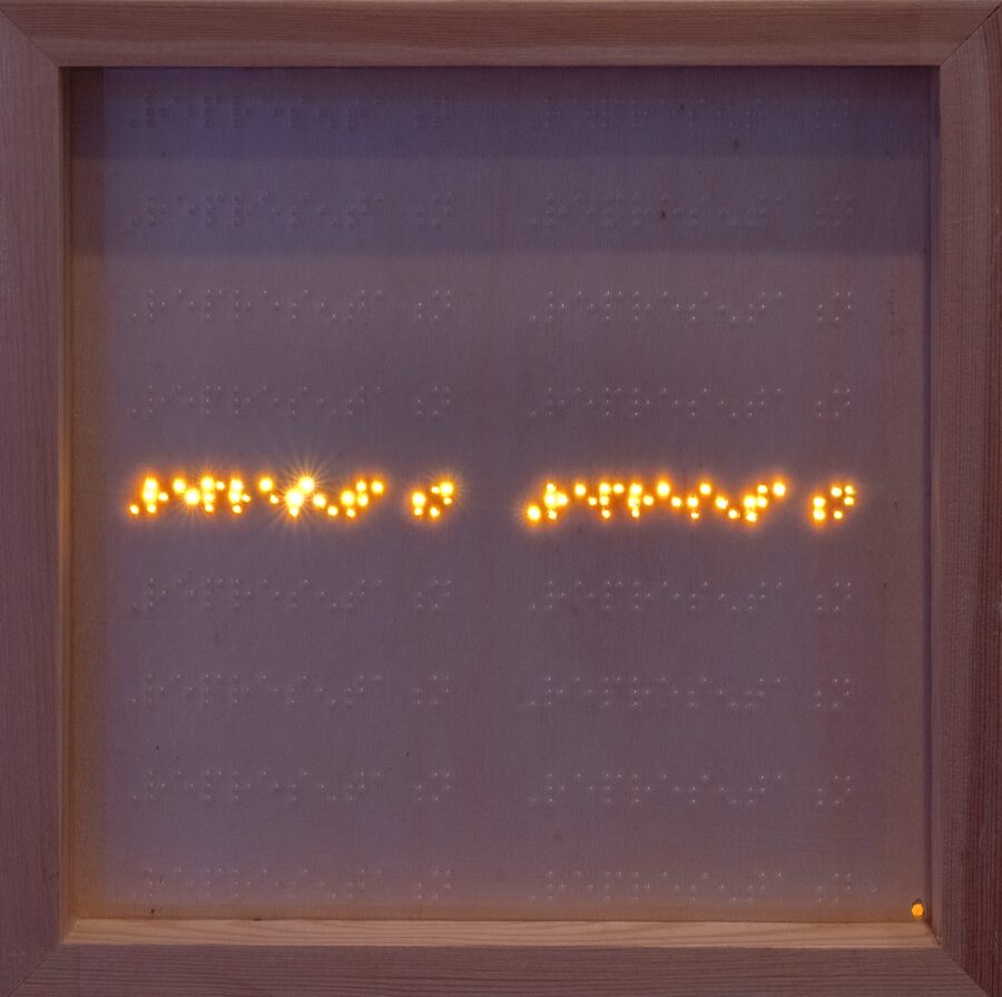 The works glow with ombre washes of pinks and purples layered across Braille paper, stretched over pale nude pine and bur-free wood. In works where light emerges from within, LED illumination pierces the surface, casting a luminous hum that underscores the material’s tactile weight. This exhibition gestures toward the intersectional realities inscribed in the archive — reminding us that within these histories, we too are present, overlapping in identities that resist erasure. By collapsing text into color, touch, and light, this exhibition turns civil rights documents into multisensory encounters — works that preserve while also declaring. The title echoes the cadence of protest chants — “This is our movement!” … “This is what access looks like!” … “This is the people’s power!” — folding archive into immediacy, and history into presence. THIS ARCHIVE IS US reminds us that the voices embedded in law and memory are not distant records.