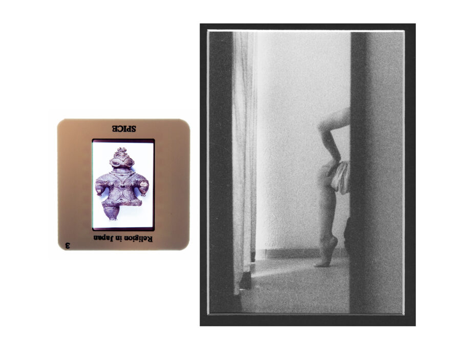 Photography facilitated the collection of objects, people, and places, creating a new system of visual information and archiving. Lensless processes continue to be used in photograms of the artists’s signature bun, which mark the accumulation of the artist’s time in the darkroom. Questions around methods of archival collections are addressed in the work A Japanese Girl, where notions of cultural biases are challenged through an eschewing of the frontal gaze in an artist-expanded archive. The activation of archives continues with 35mm slides coming from Heritage Museum collection in conversation with Aoki’s own photographs. The artist, a descendant of light (the sun), draws images of and with the body, through the photographic medium, variations of light-images.