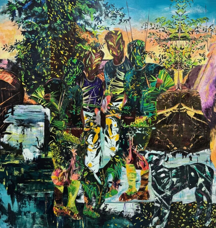 moniquemeloche is pleased to present Maia Cruz Palileo: Branch Dance, the artist’s fourth solo exhibition with the gallery. Palileo’s practice encompasses painting, sculpture, installation, and drawing to question how belonging, assimilation, memory, and displacement intertwine. In their research-based practice, Palileo interrogates ethnographic images from Philippine archives alongside their family’s oral histories and photographs, producing lush landscapes where rivers morph, figures emerge from the trees, and boundaries blur, break, and mirror—obscuring the line between fact and fiction. Branch Dance presents a series of new paintings, works on paper, and ceramic sculptures that reconfigure imagery from colonial postcards, stereoscopic images, and studio portrait photography taken during the US occupation of the Philippines to examine how stories change over time, how memory is imperfect, and how imagination can fill the gaps in historical documentation to counteract Imperialism’s parasitical gaze.