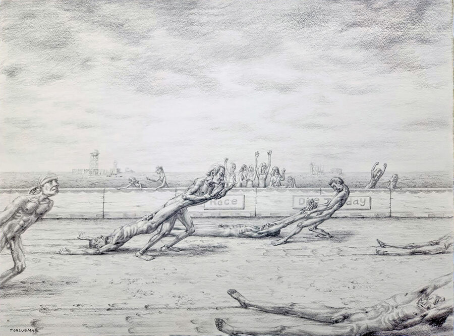 Tom Torluemke is known for his ambitious and evocative socio-political paintings. Drawing is the rarely seen starting point and driving force in his practice. It serves as a meditative and relaxing exercise, a testing ground for ideas, and a springboard for the direction the artist takes when pursuing a project. This exhibit features a selection of drawings by the artist stemming from three areas of the artist’s work: plein air landscape drawings of the area near the artist’s home, fanciful and personal autobiographical graphite drawings, and studies for the artist’s large, imaginative, ambitious socio-political paintings.