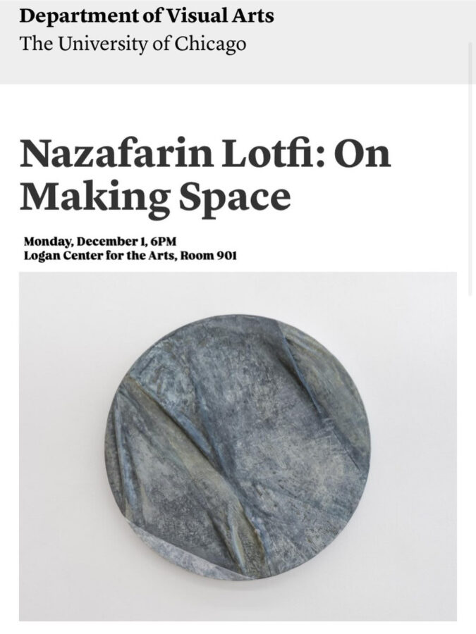 The Open Practice Committee invites you to join us for an artist talk with artist and DoVA faculty member, Nazafarin Lotfi. How has space, and our relation to space, shaped our identities and sense of self throughout time? How does a self-contained body operate within space vs. a body assumed as incomplete? Lotfi will discuss her work, recent exhibitions, and some of the leading questions that fuel her practice.