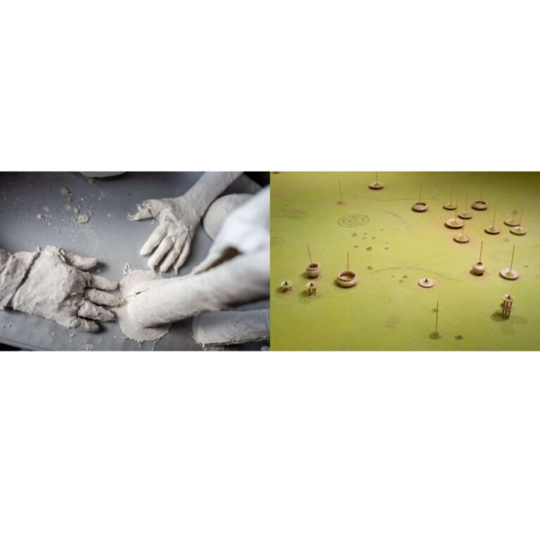 Anchoring the exhibition is a collaborative installation by Yoo and Couch. Couch’s ephemeral sculpture, suspended from the ceiling, consists of a “winding cloth” garment entombed in plaster, its final form suggesting both the figure and its void. His designs are simultaneously functional and narratively conceptual, referencing historically restrictive western fashion only to alter their constraints into garments for an alternative, imagined future. Surrounding Couch’s sculpture, Yoo’s incense vessels are carefully arranged – these vessels are hand built from a solid tree resin, made from the gathered pine needles from the fallen christmas tree. In using tree sap, Yoo alludes to its medicinal history as a remarkable healing material. At the core of his practice is an exploration of healing through cycles of decay and growth, transmuting a single source material (gathered pine needles) into resin, oil, and dust, which manifest as vessels, incense, and sculptures, and thus creating life anew.