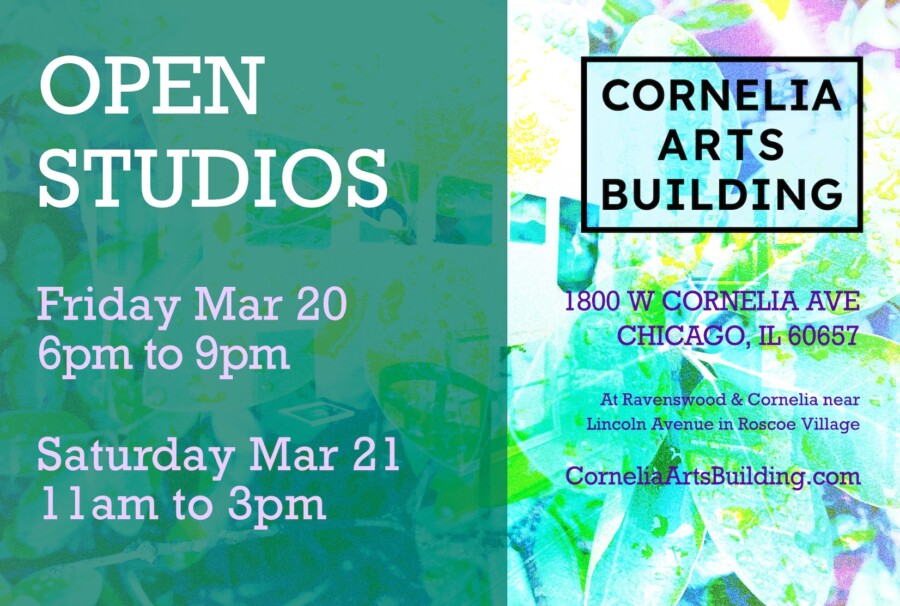 Discover new artists and visit familiar favorites at the Cornelia Arts Building March Open Studios. Located at 1800 West Cornelia Avenue, Chicago, Illinois, the all-artist studio building opens its doors to the public on Friday March 20th from 5 – 9 pm, and on Saturday March 21st from 12 noon to 4 pm. Visitors can shop two floors of over two dozen artists open that weekend, and find unique gifts of art and crafts at one of the largest artist studio buildings on Chicago’s North side. Guests of all ages are welcome.