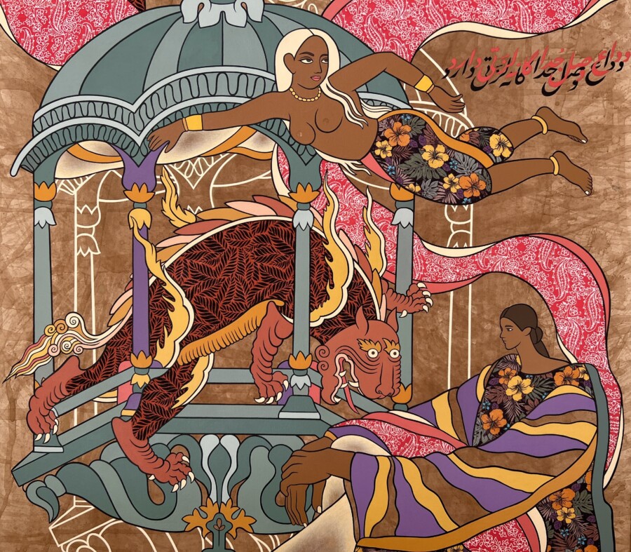 This body of work draws inspiration from classical South Asian and Sufi narratives — poems like Gulshan-i ‘Ishq, Madhumalati, Hamzanama, and other mythic romances — in which a recurring motif unfolds: a man undertakes perilous journeys through dark forests, confronts fearsome beasts, and ultimately rescues a princess, a figure often depicted as helpless, without agency. Zaidi revisits these stories and their characters, rewriting their narratives to reflect a contemporary perspective on women’s lives, power, and autonomy. She reimagines the monstrous and ferocious imagery of these manuscripts, transforming demons into whimsical, cartoon-like figures that coexist with women rather than threaten them. Through this intentional shift, Zaidi proposes that once fears or harmful myths are confronted, they lose their power — and can even appear absurd or playful. By situating women as active, self-determined participants rather than passive figures to be saved, her paintings interrogate and subvert the traditional fairy tales and Sufi myth, recontextualizing them for a contemporary lens.