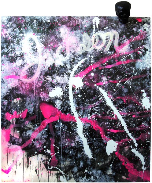 David Leggett’s ultra-vivid canvases mash-up a love-hate fascination with both machismo in hip-hop culture and the unyielding influence of 1980s German painters in current contemporary painting. No one is sacred in Leggett’s work – from Precious to Rick Ross to Gerhard Richter to the artist himself – his satirical images are often punctuated by barbed comedic one-liners, a strategy influenced by the stand-up comedians he listens to in the studio. Leggett his manipulation of cartoon imagery and caricature reveals the influence of Chicago Imagists like Karl Wirsum and Jim Nutt. His use of craft materials, however, complicates his relationship to painting as googly eyes, rhinestones, pom-poms, felt, glitter, gold and silver leaf add a layer of absurdity to Leggett’s reverence for his painting heroes. In the past year, Leggett’s studio suffered a devastating flood, destroying some 50 finished paintings. States Leggett: “When I saw all my paintings damaged from the leak I couldn’t help but notice how small the paintings were. I felt I wasn’t challenging myself. It felt like what I was doing wasn’t important.” This show, post-flood, will feature Leggett’s largest canvases to date.