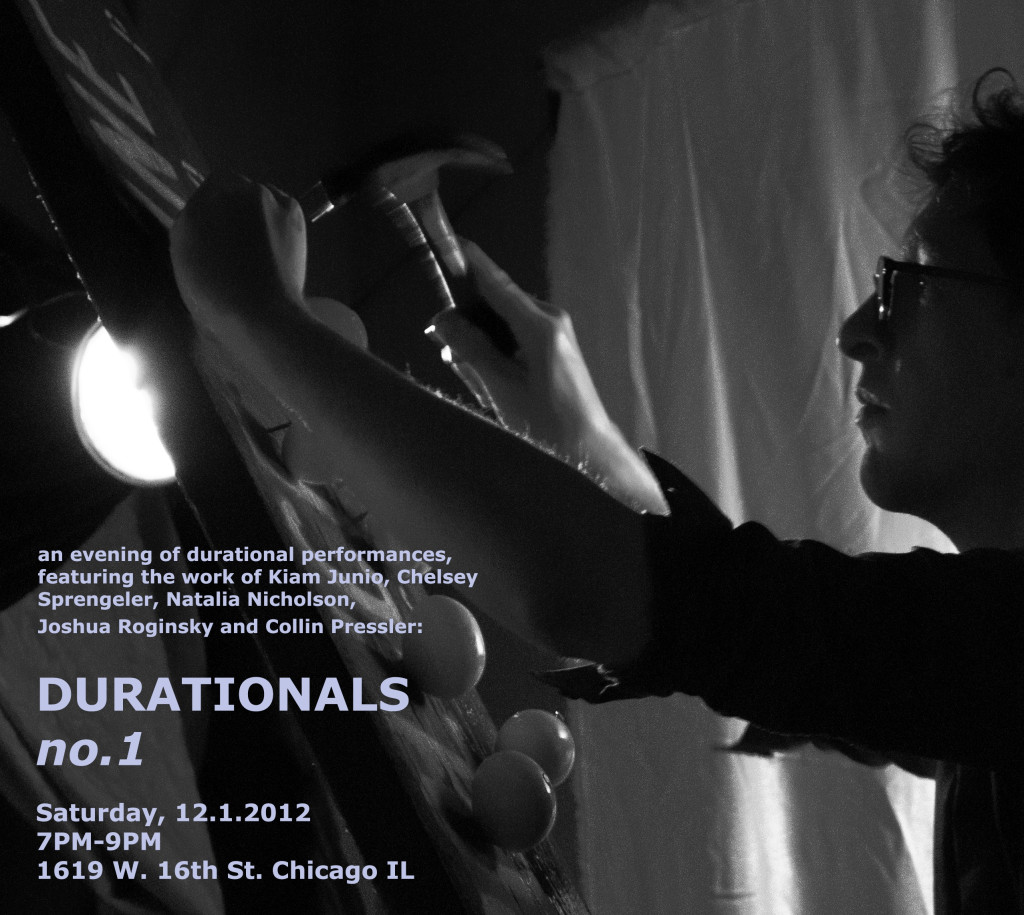 Please join us Saturday December 1st for an evening of durational performances at Anatomy/Gift/Association, featuring the work of Kiam Junio, Chelsey Sprengeler, Natalia Nicholson, Joshua Roginsky and Collin Pressler.