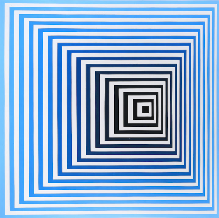 “Cacchiarelli’s impeccable lines of tonal colors suggest a progressive variation from deep blue, from neutral black and from derived ochre, such as gold, that converge toward the back of the plane to simulate depth and, at the same time, deliberately distort the vanishing point. The serial repetition of a single visual motif – the subtle or pronounced variations of size and color – establishes a retinal dialogue between the work and the viewer’s mind, which reconstructs it, conditioned by emotional and cultural factors. In that manner, Cacchiarelli recreates dynamic vibrations that emanate an inexplicable enthusiasm.”