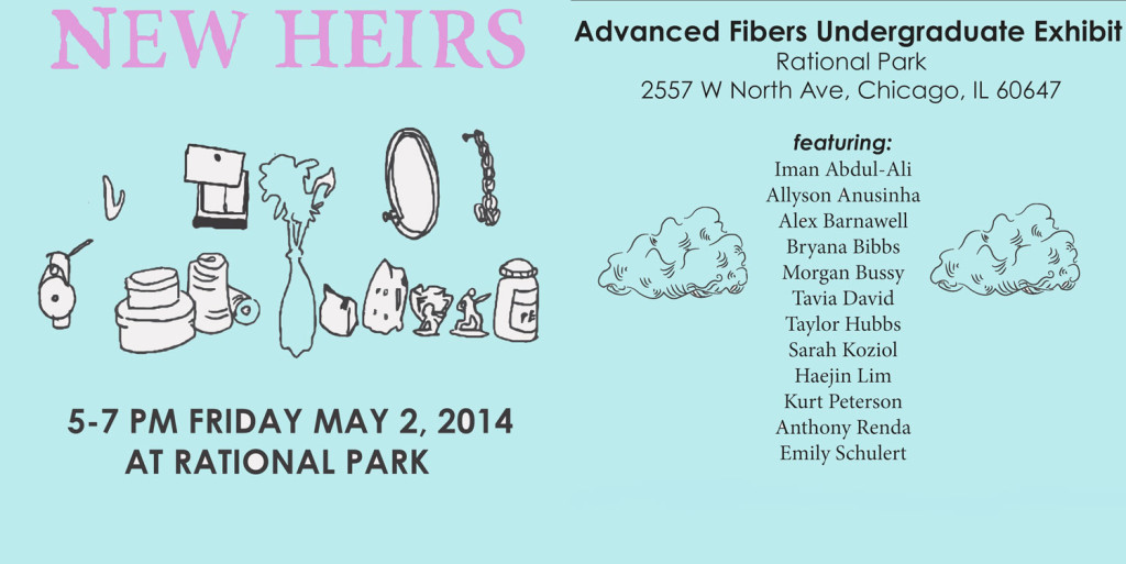 The School of the Art Institute of Chicago (SAIC) presents New Heirs, an exhibition opening Friday, May 2nd at Rational Park Gallery (2557 W. North Ave) from 5-7pm. Open for three days only, New Heirs is the climactic manifestation of work created over the course of four months by a group of 12 emerging young artists working within the Advanced Fiber and Material Studies Studios.