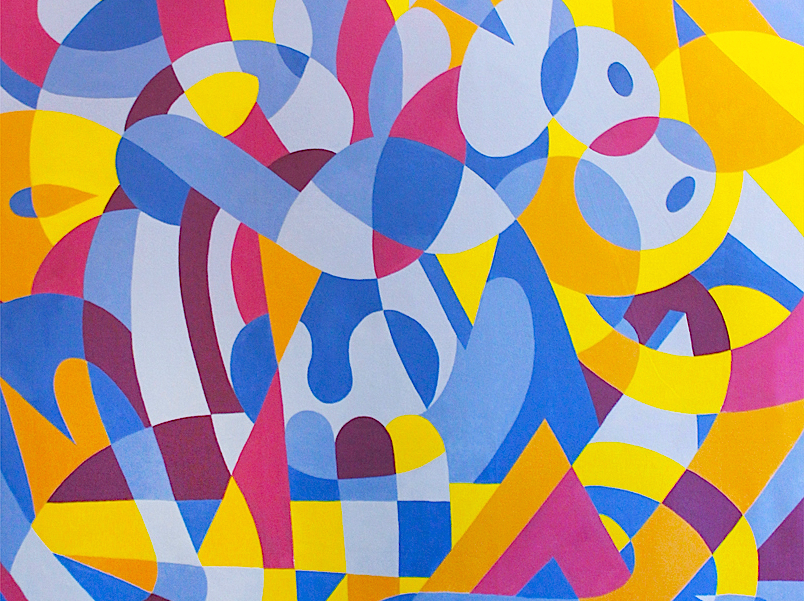 Pigment of My Imagination features paintings from Greg Mike’s latest body of work. The selections embody the saturated colors and classic cartoon imagery that has come to be expected from the artist, but these works have at their thematic core an exploration of interactions, connectivity, and relationships in the contemporary world. Not allowing these themes to rest lightly on the surface, Greg Mike has buried them under deconstructed cartoon imagery, punctuated by his highly refined color palette and concise line work. The resulting abstract shapes create an alternate atmosphere where intersecting colored elements create multiple narratives and evoke memories and feelings. Greg Mike says that he finds inspiration for this work in “everything from the 1920’s rubber hose animation to present day pop culture”. Pigment of My Imagination is, in his words: “a culmination of both past and present with a glimpse into the future.”