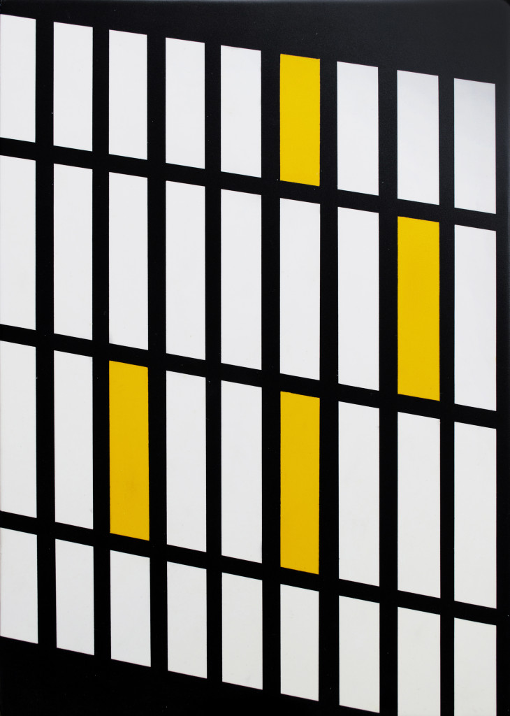 The paintings in Light/Industry/Coating are indebted to excel spreadsheets, skateboard graphics, running shoe displays, enrollment strategies, labor economies, big box DIY warehouses and materials found in various light/cottage industries. Thin, tablet sized grid paintings line the wall on a shallow shelf. The black color fields of the paintings blend into the black gallery wall, projecting various color differences in the field, or grid, forward. Attached to this series are two ’ x 7’ plexi-glass acrylic paintings. These larger paintings act in contradistinction to their smaller counterparts. While the smaller tablet sized paintings function primarily as objects, the high gloss surface of these larger pieces function experientially, mirroring, expanding and refracting the space as a whole.