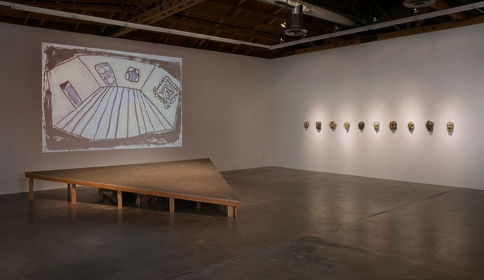 Universal Declaration of Infantile Anxiety Situations Reflected in the Creative Impulse is an exhibition by My Barbarian collective who are artists Malik Gaines, Jade Gordon, and Alexandro Segade. Founded in Los Angeles in 2000, My Barbarian combines elements of theater and visual art to create interdisciplinary works in video, music, performance, drawing, and sculpture. Their solo exhibition at Gallery 400 includes a live staging of the group’s interpretation of Bertolt Brecht’s 1932 play, The Mother, and a video, Working Mother (2013). Hand-made masks and drawings associated with this performance will activate the gallery space for the show’s duration.