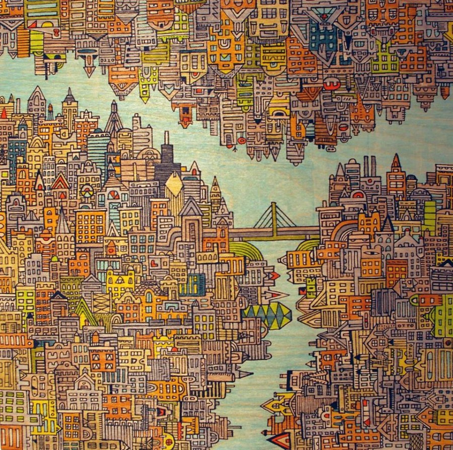 Galerie F kicks off this summer in Chicago with a vibrant exhibition celebrating cities. After a long winter, we’re sorely missing the energy of epic, endless summers. There are few better places on Earth to be than in the middle of your favorite city when the days are long and bursting with thrills. Nate Otto Art leads this show with new and exclusive works exploring the bustling patterns of life within intricate cityscapes. He is accompanied by a fitting group of contributors also exploring cities, both near and far, through architecture, geometry and fantastic personal interpretation.