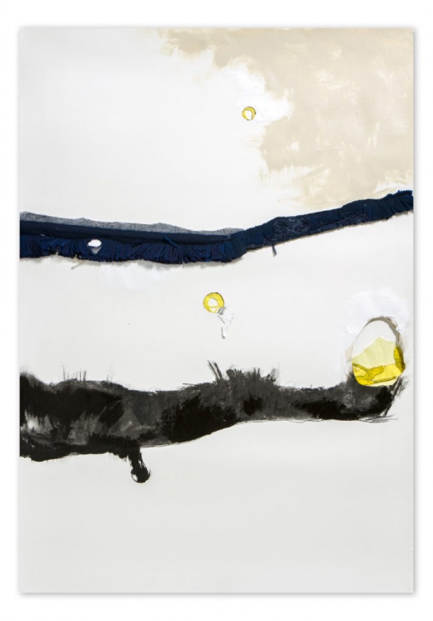 “Starting with a blank piece of paper, I break ground and lay an array of reclaimed materials to inhabit a rising landscape- a lost and found process, of sorts. I disappear into this imaginary world, imposing an atmospheric collection of embedded, sutured, burned, threaded, and cut throwaways between 2 ½ dimensions. Unloved plastics, discarded fabrics and ordinary scraps intimately collide with darkness and light, expanding the quiet tension that takes captive my daily experiences of chaos and rest.”
